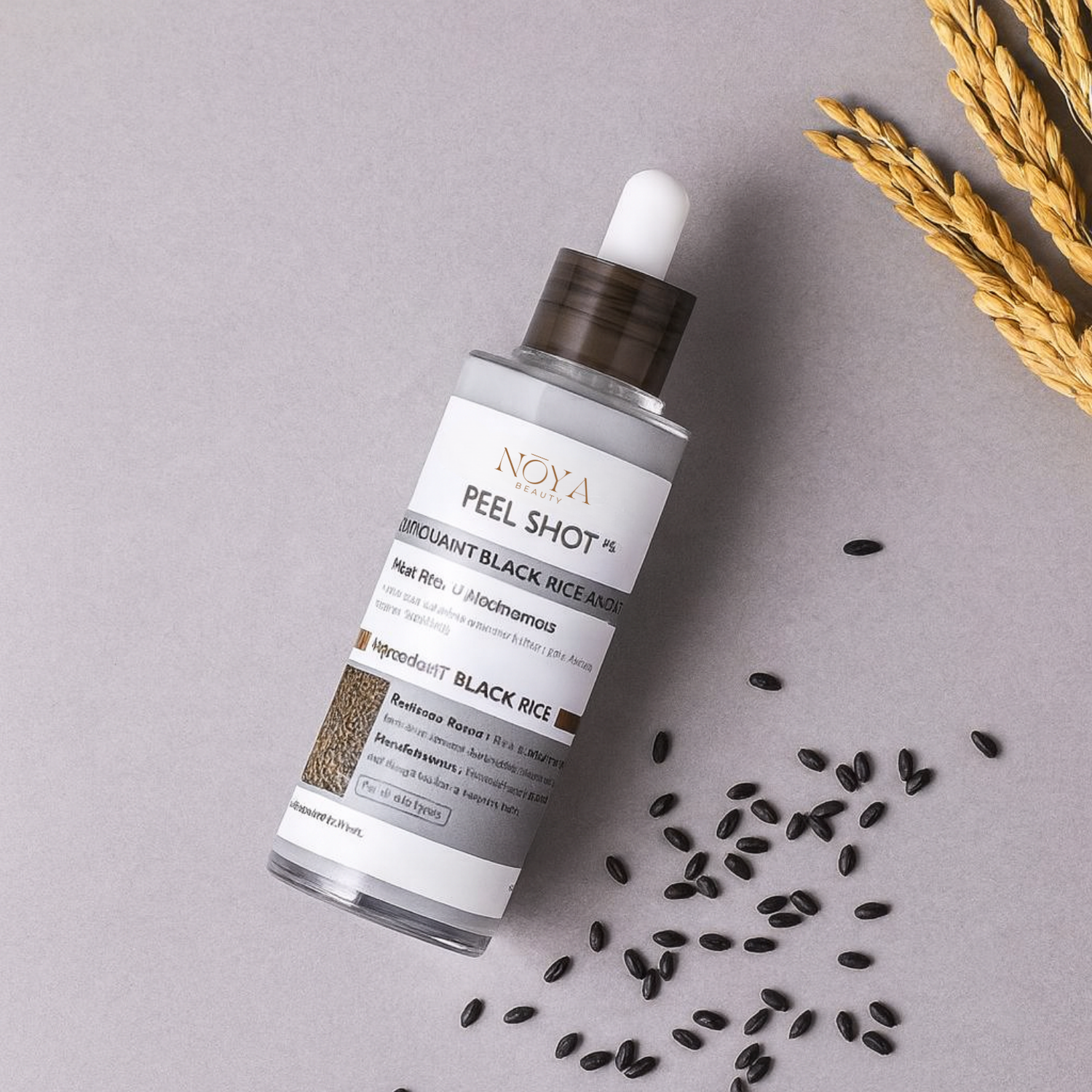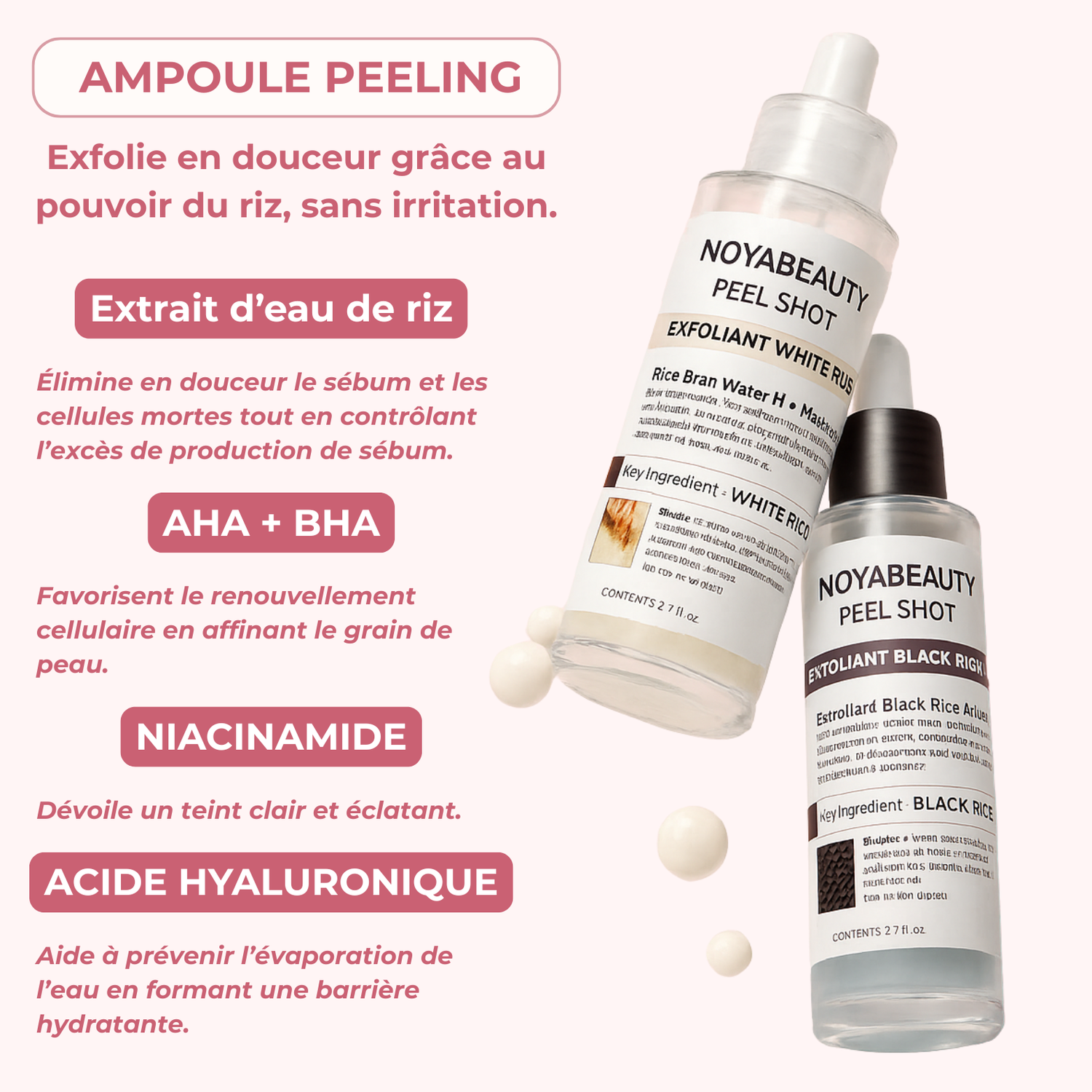 PeelShot™ exfolie en douceur grâce à une formule enrichie en eau de riz fermentée, AHA et niacinamide. Il élimine les cellules mortes, désobstrue les pores et révèle une peau plus lisse, douce et lumineuse dès les premières applications.