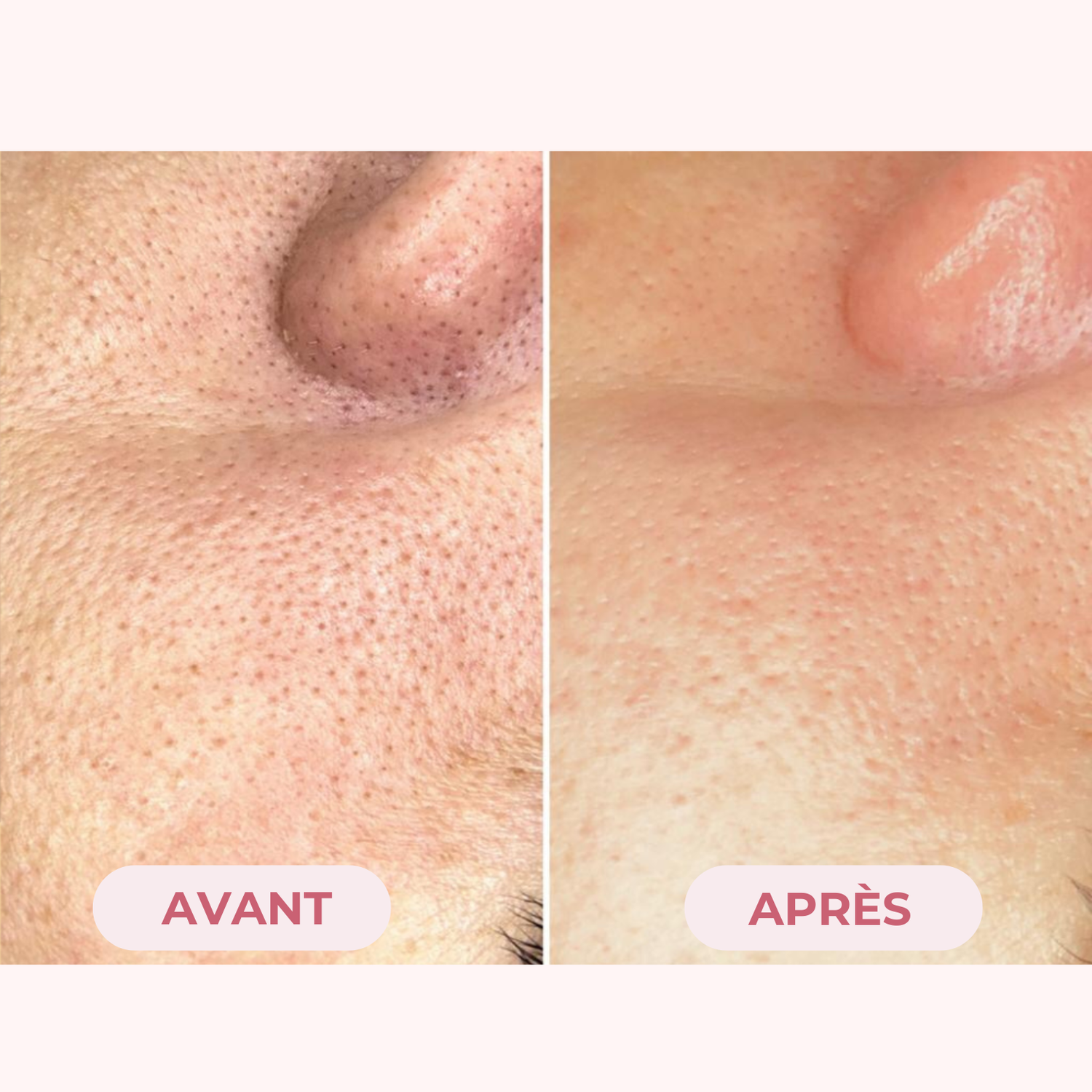 Beaucoup d’utilisatrices constatent une amélioration dès la première utilisation. Pour des résultats durables (pores resserrés, peau plus nette), comptez environ 1 à 2 semaines d’utilisation régulière.